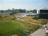 To the left, the driving range. To the right, the contestants' parking lot.