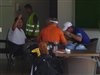 Joel Sjoholm and Bernd Wiesberger stop for a bite to eat in the clubhouse.