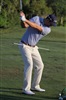 He runs an alignment stick through his front belt loops, then takes a few practice swings to rehearse of the feeling of getting his hands back in front of his body.