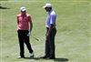 Dave Phillips of the Titleist Performance Institute looks on as Titleist Brand Ambassador Zach Johnson tests a new Vokey Design Spin Milled wedge to help with the heavy sand in Congressional's bunkers.